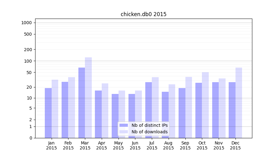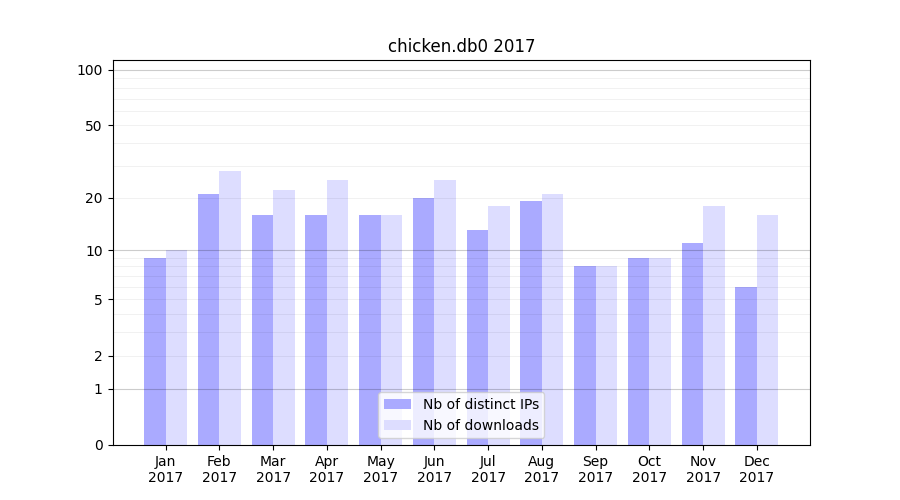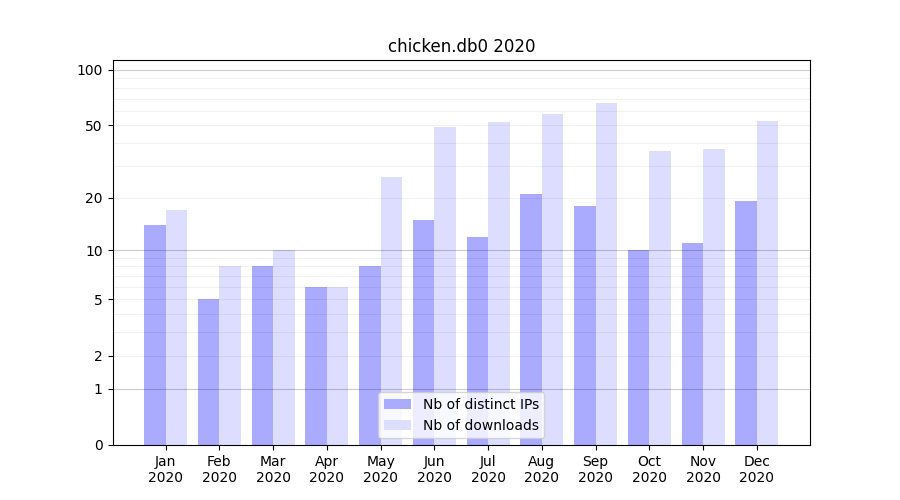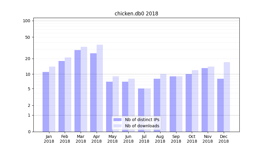 Number of downloads for annotation package chicken.db0, year by year, from 2025 back to 2014 (years with no downloads are omitted):