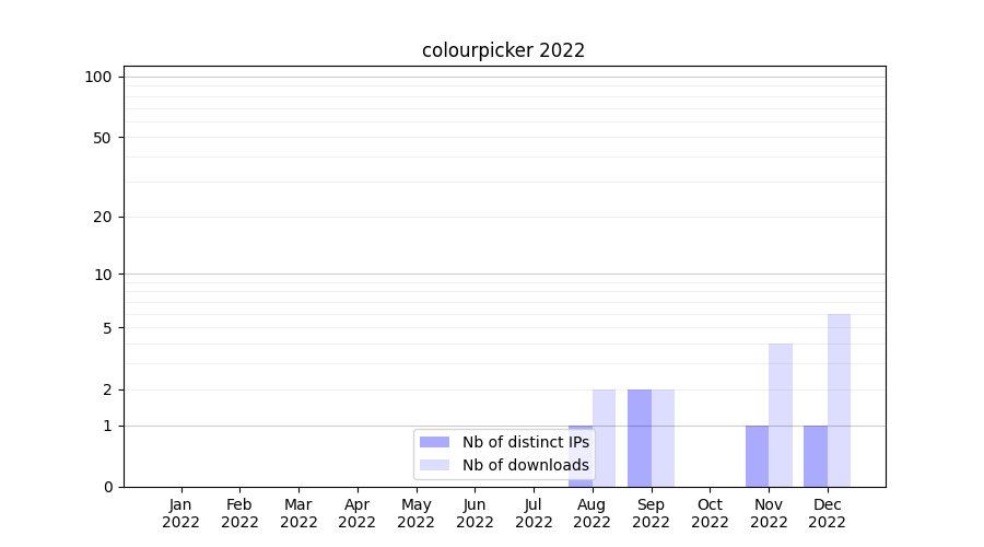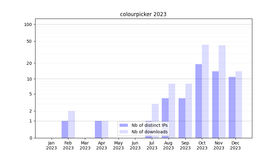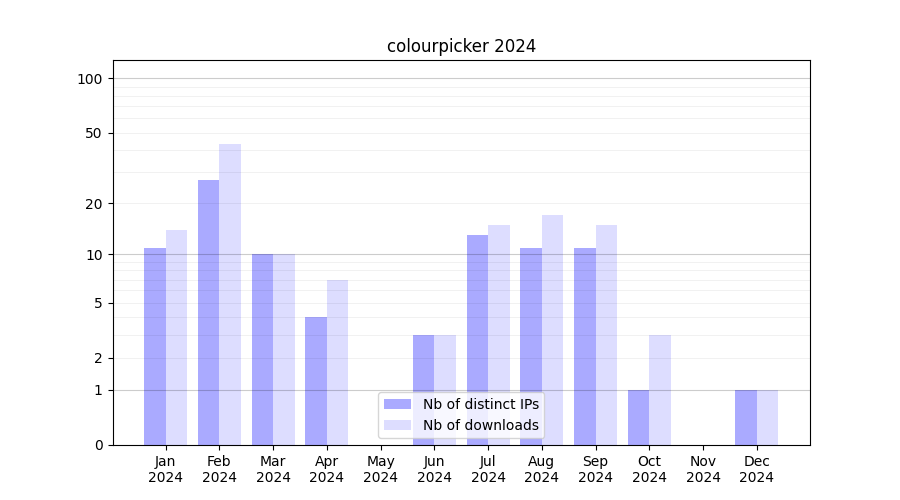 Number of downloads for annotation package colourpicker, year by year, from 2025 back to 2014 (years with no downloads are omitted):