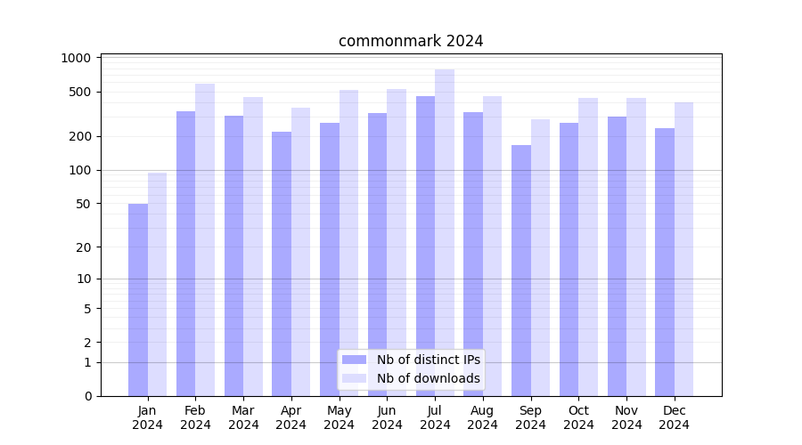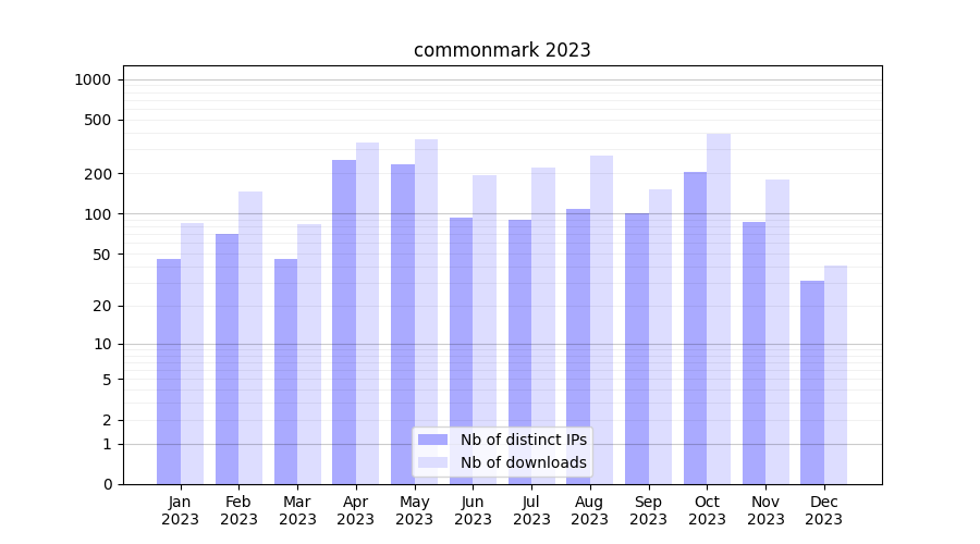 Number of downloads for annotation package commonmark, year by year, from 2025 back to 2014 (years with no downloads are omitted):