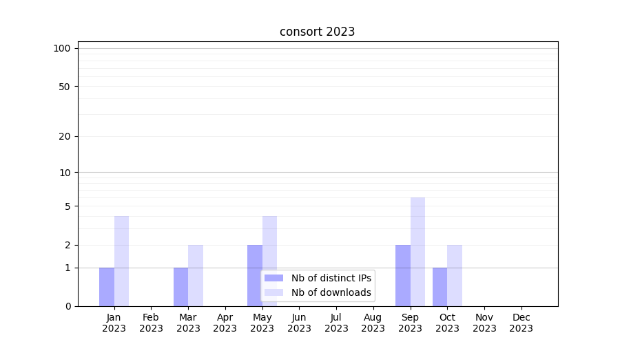 Number of downloads for annotation package consort, year by year, from 2025 back to 2014 (years with no downloads are omitted):