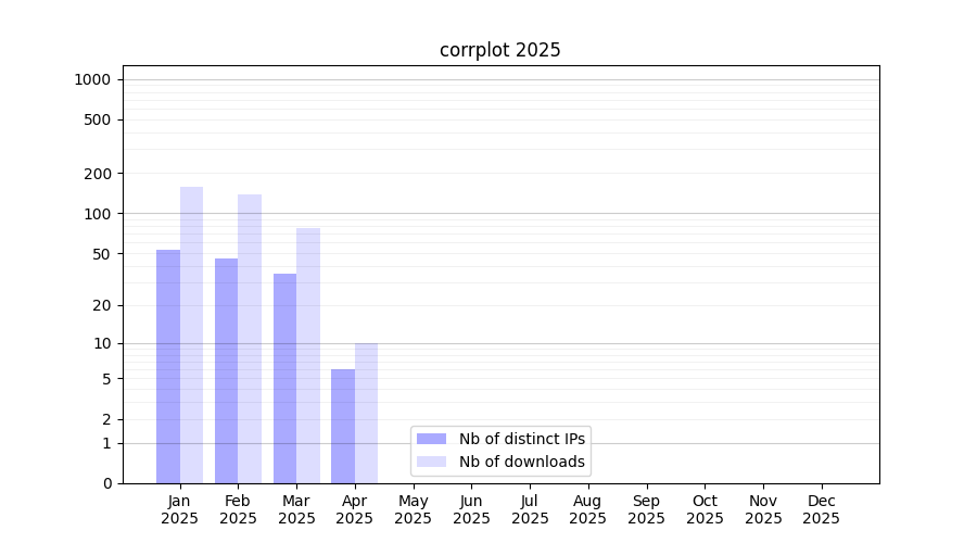 Number of downloads for annotation package corrplot, year by year, from 2025 back to 2014 (years with no downloads are omitted):