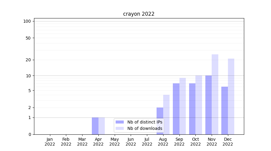 Number of downloads for annotation package crayon, year by year, from 2025 back to 2014 (years with no downloads are omitted):