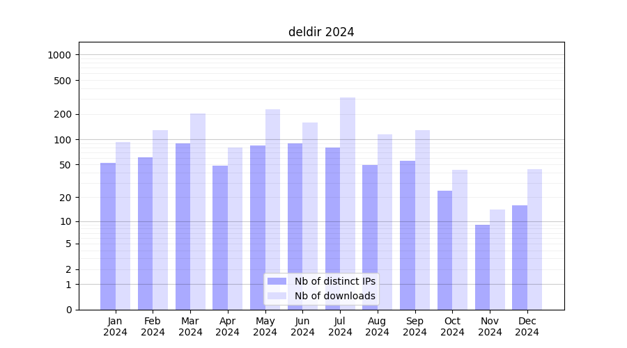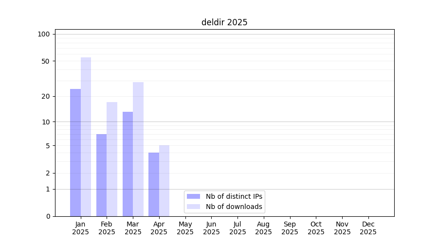 Number of downloads for annotation package deldir, year by year, from 2025 back to 2014 (years with no downloads are omitted):