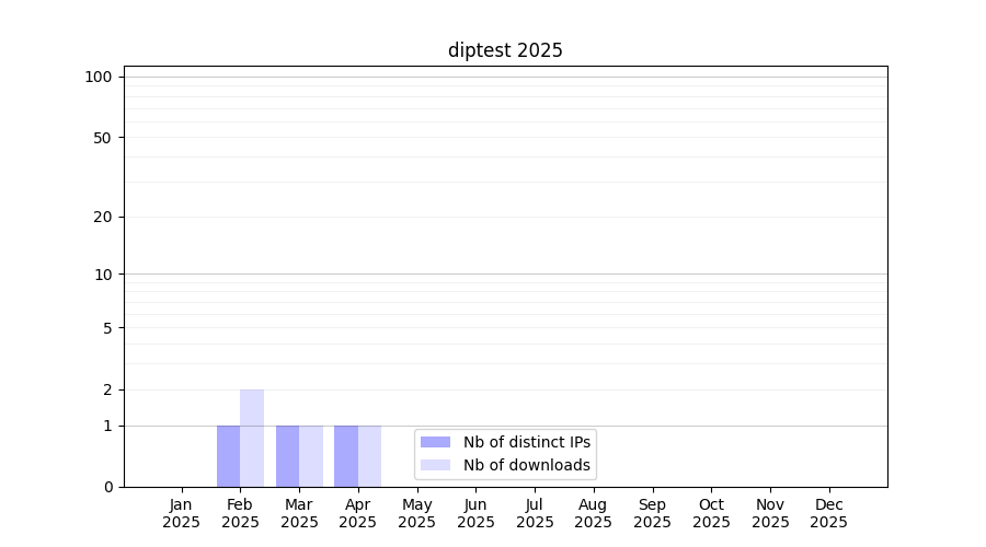 Number of downloads for annotation package diptest, year by year, from 2025 back to 2014 (years with no downloads are omitted):
