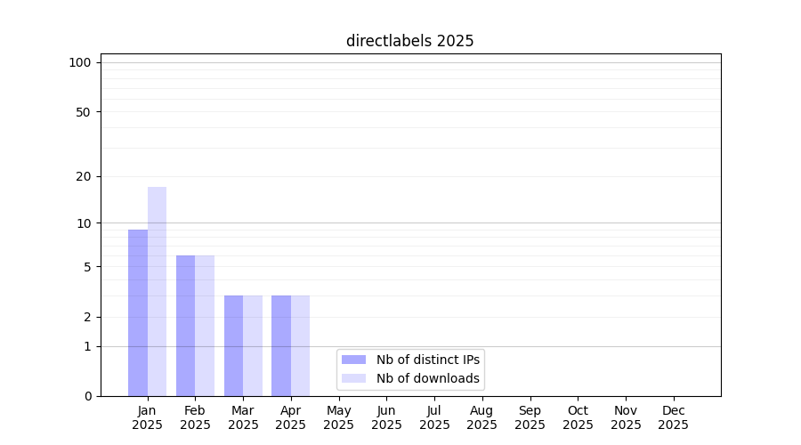 Number of downloads for annotation package directlabels, year by year, from 2025 back to 2014 (years with no downloads are omitted):