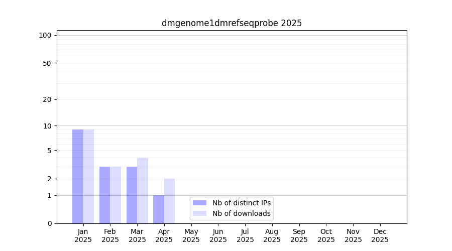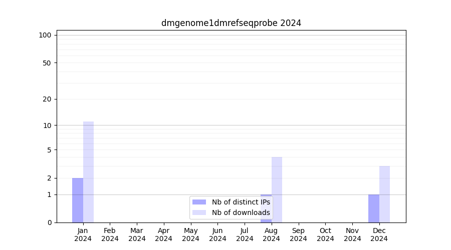 Number of downloads for annotation package dmgenome1dmrefseqprobe, year by year, from 2025 back to 2014 (years with no downloads are omitted):