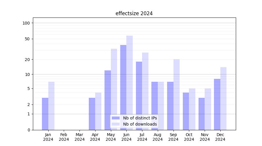 Number of downloads for annotation package effectsize, year by year, from 2025 back to 2014 (years with no downloads are omitted):
