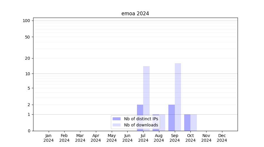 Number of downloads for annotation package emoa, year by year, from 2025 back to 2014 (years with no downloads are omitted):