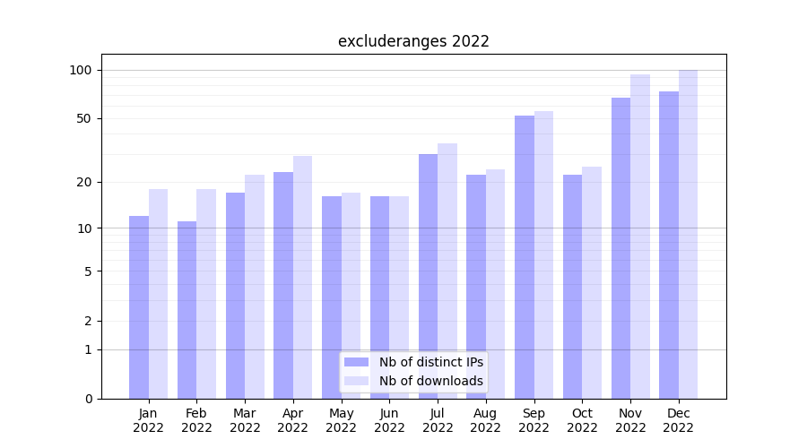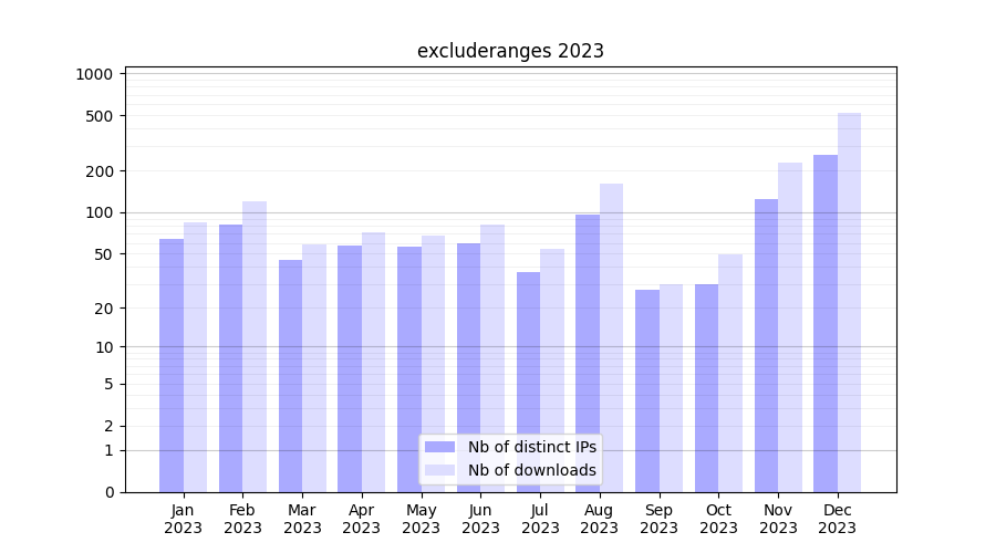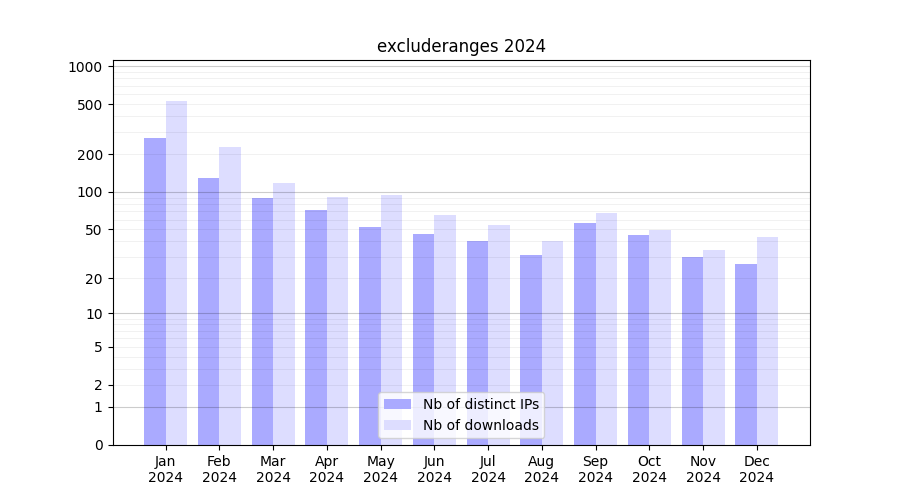 Number of downloads for annotation package excluderanges, year by year, from 2025 back to 2014 (years with no downloads are omitted):