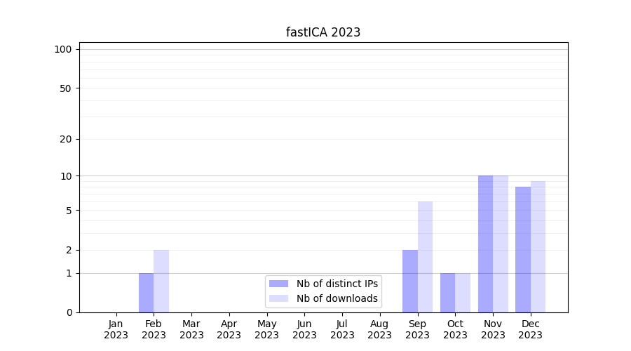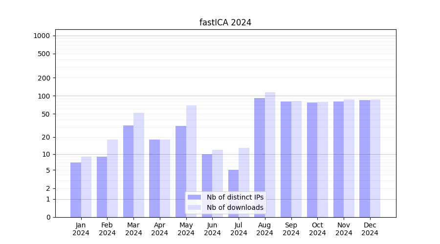 Number of downloads for annotation package fastICA, year by year, from 2025 back to 2014 (years with no downloads are omitted):