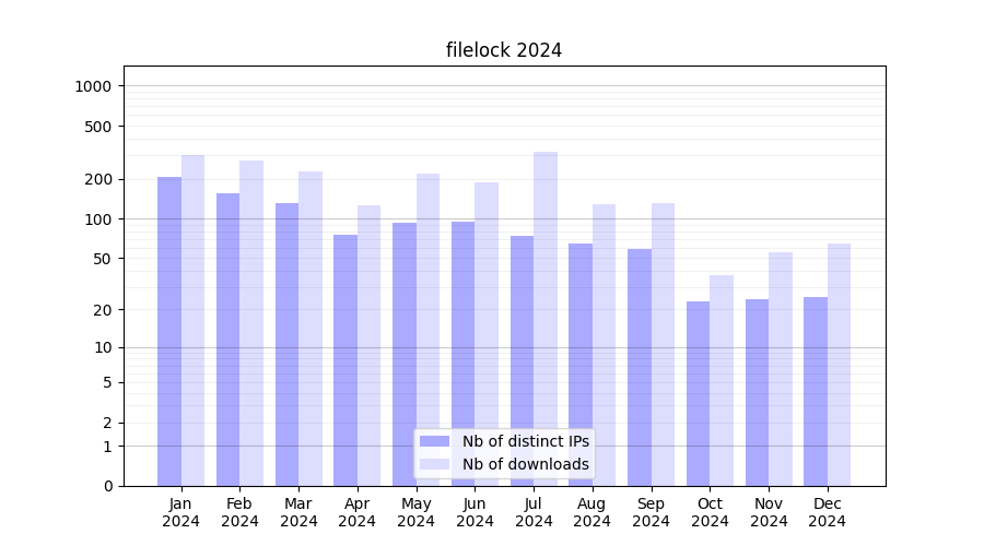 Number of downloads for annotation package filelock, year by year, from 2025 back to 2014 (years with no downloads are omitted):