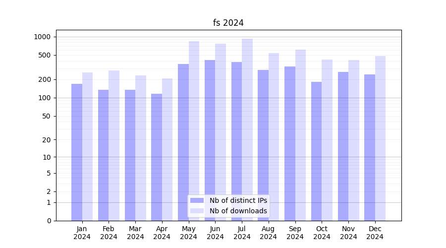 Number of downloads for annotation package fs, year by year, from 2025 back to 2014 (years with no downloads are omitted):