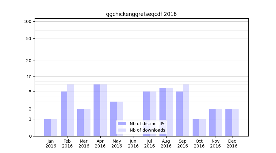 Number of downloads for annotation package ggchickenggrefseqcdf, year by year, from 2025 back to 2014 (years with no downloads are omitted):