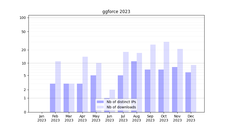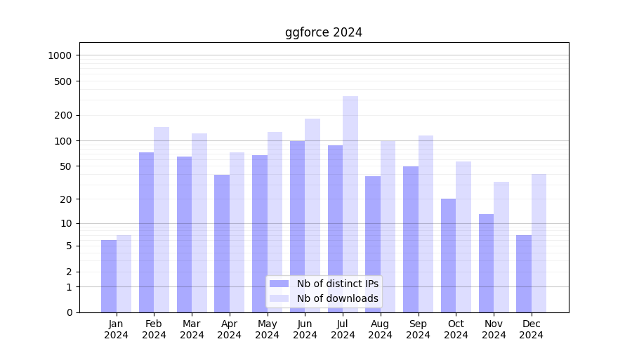 Number of downloads for annotation package ggforce, year by year, from 2025 back to 2014 (years with no downloads are omitted):