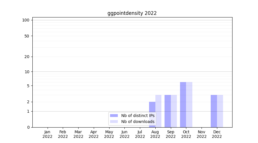 Number of downloads for annotation package ggpointdensity, year by year, from 2025 back to 2014 (years with no downloads are omitted):
