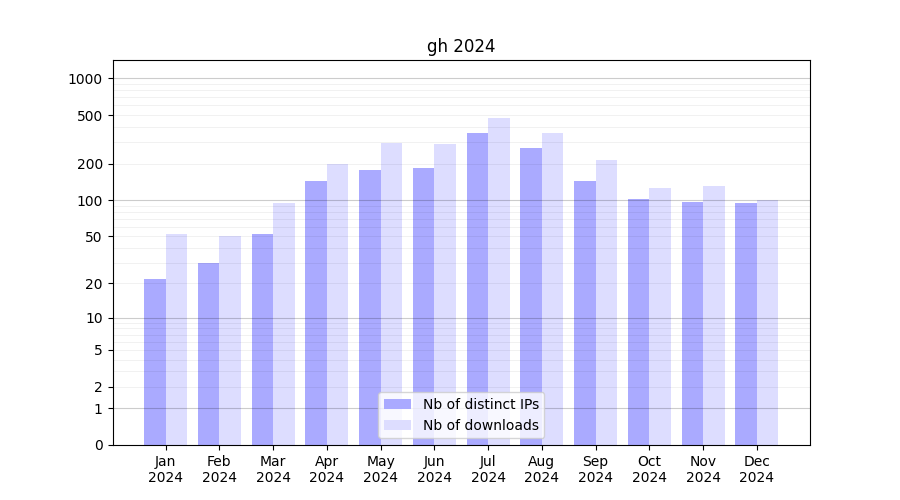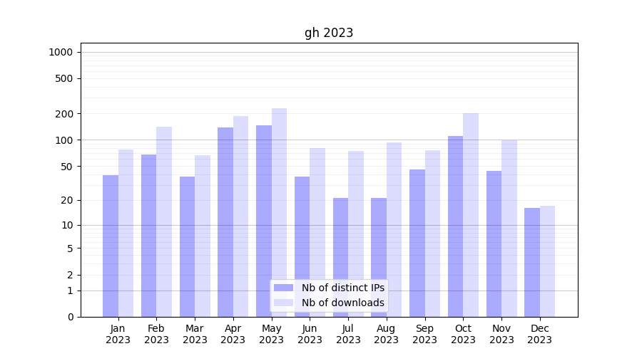 Number of downloads for annotation package gh, year by year, from 2025 back to 2014 (years with no downloads are omitted):