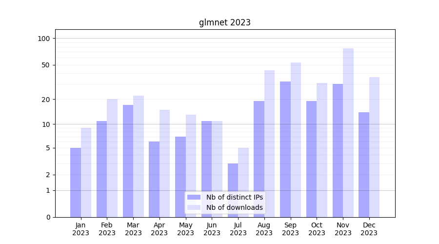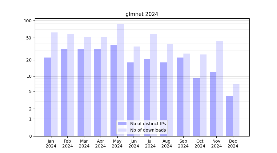 Number of downloads for annotation package glmnet, year by year, from 2025 back to 2014 (years with no downloads are omitted):