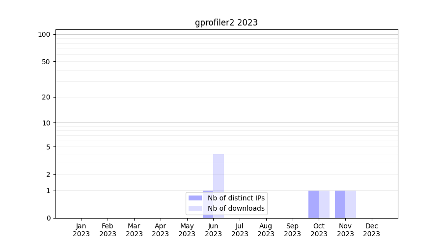 Number of downloads for annotation package gprofiler2, year by year, from 2025 back to 2014 (years with no downloads are omitted):