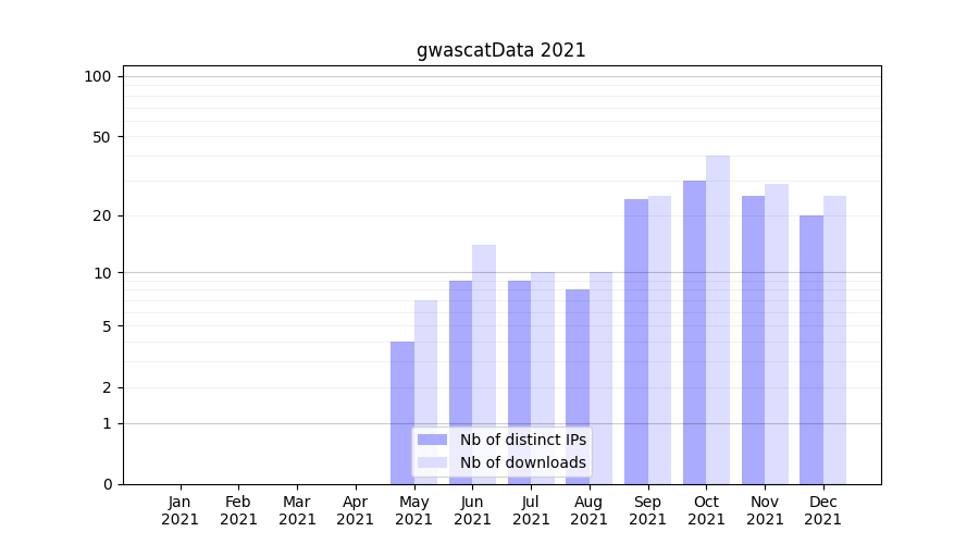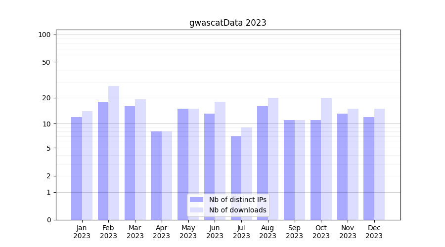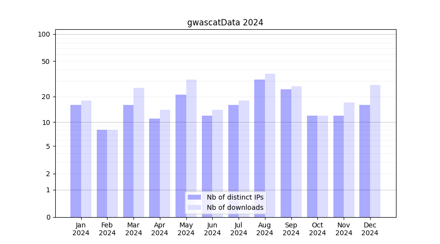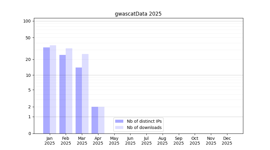 Number of downloads for annotation package gwascatData, year by year, from 2025 back to 2014 (years with no downloads are omitted):