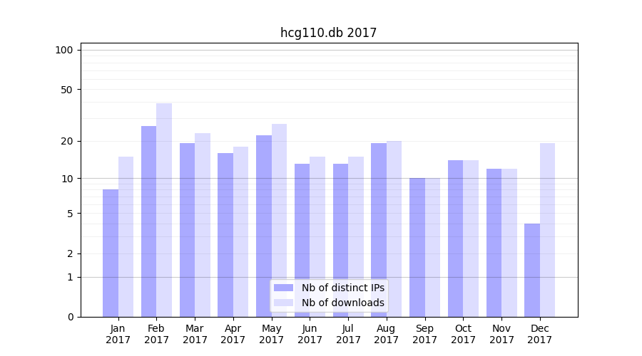 Number of downloads for annotation package hcg110.db, year by year, from 2025 back to 2014 (years with no downloads are omitted):