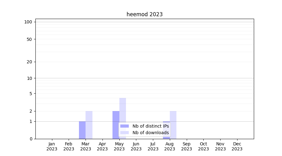Number of downloads for annotation package heemod, year by year, from 2025 back to 2014 (years with no downloads are omitted):