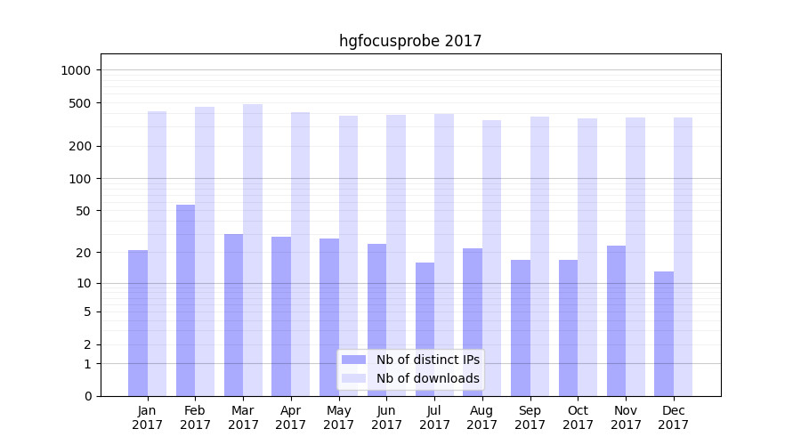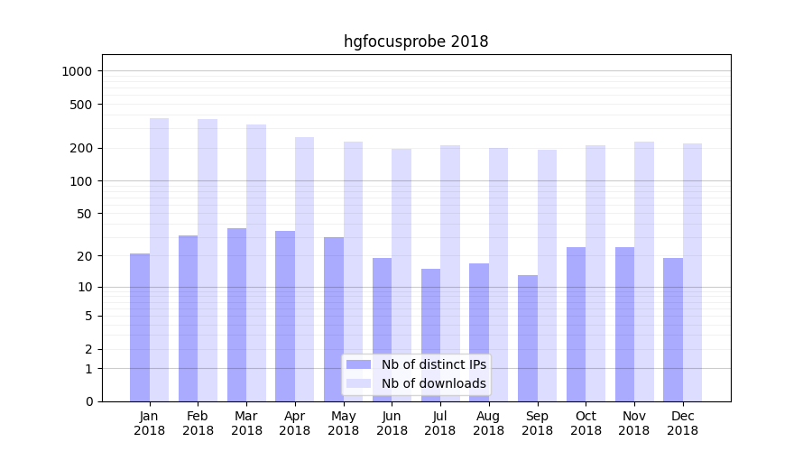 Number of downloads for annotation package hgfocusprobe, year by year, from 2025 back to 2014 (years with no downloads are omitted):