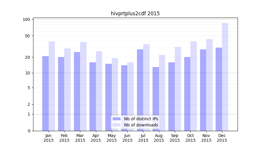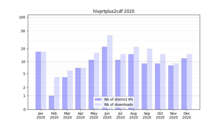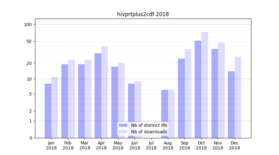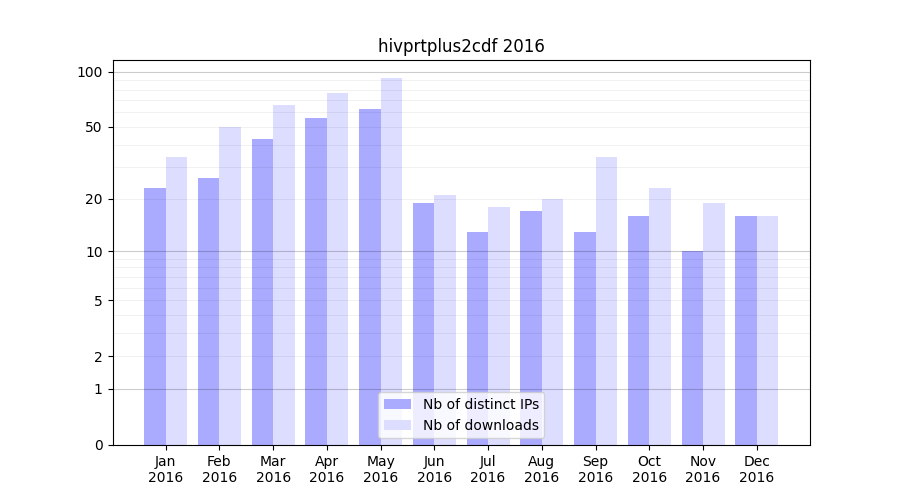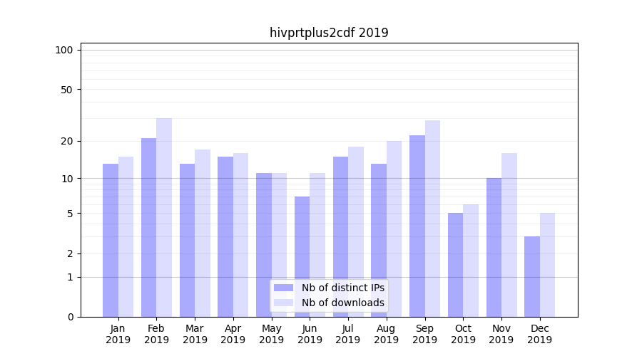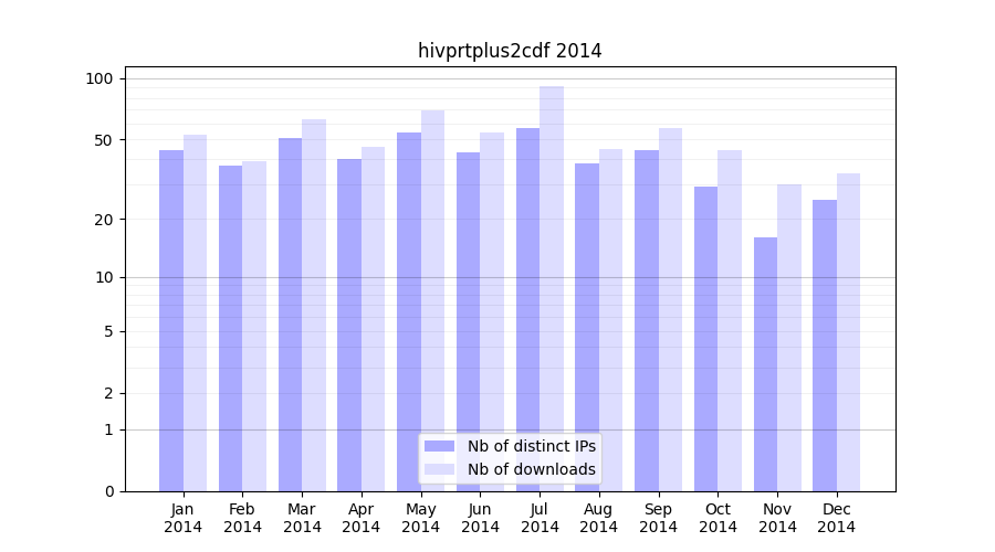 Number of downloads for annotation package hivprtplus2cdf, year by year, from 2025 back to 2014 (years with no downloads are omitted):
