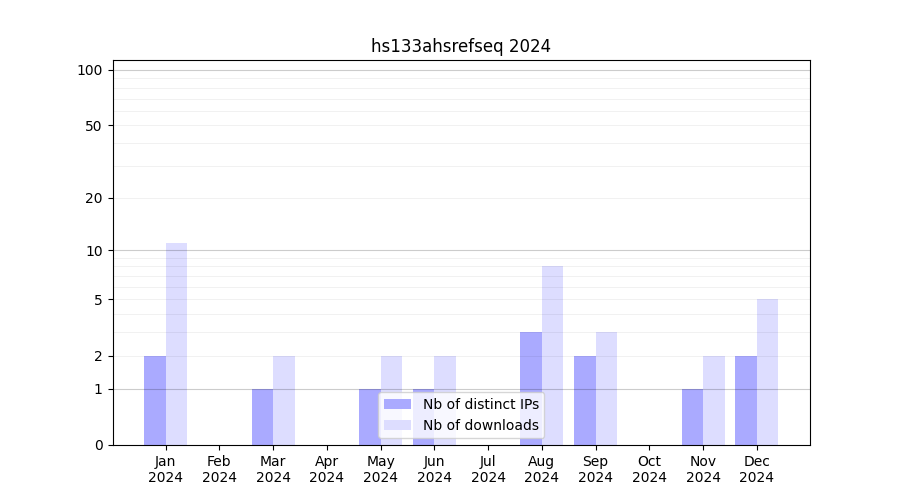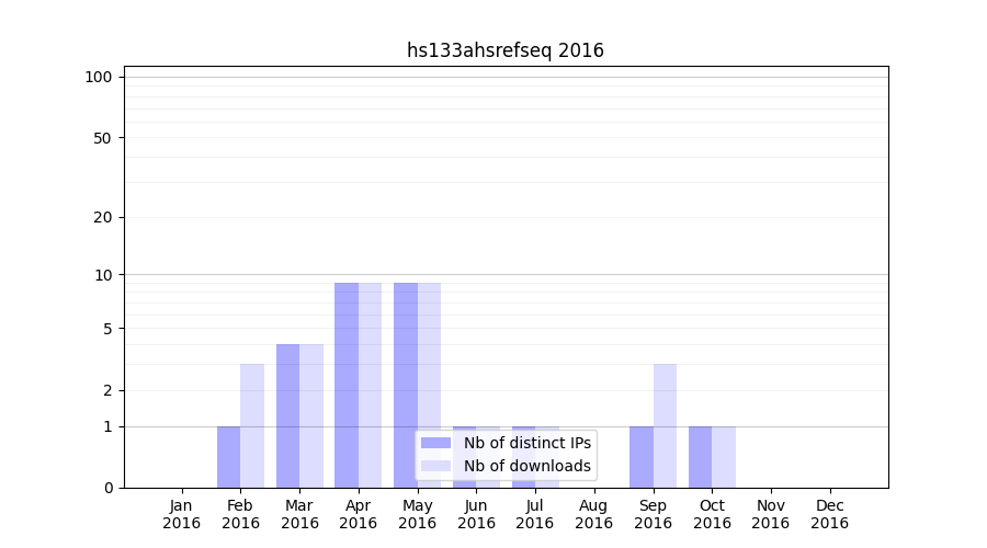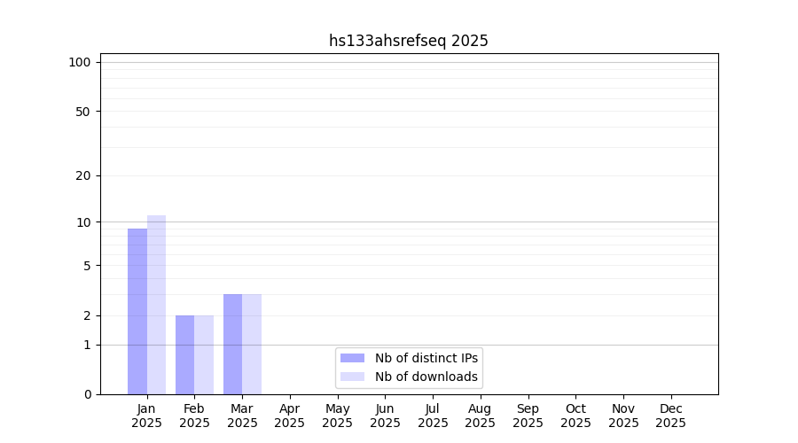 Number of downloads for annotation package hs133ahsrefseq, year by year, from 2025 back to 2014 (years with no downloads are omitted):