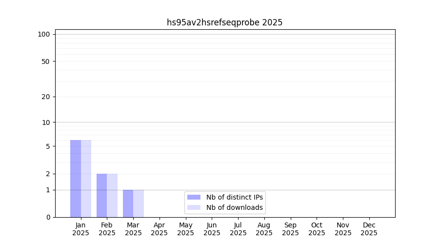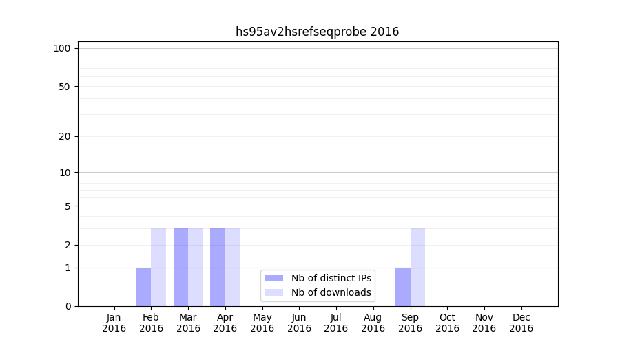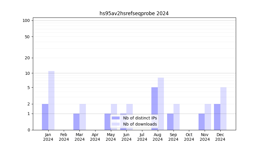 Number of downloads for annotation package hs95av2hsrefseqprobe, year by year, from 2025 back to 2014 (years with no downloads are omitted):