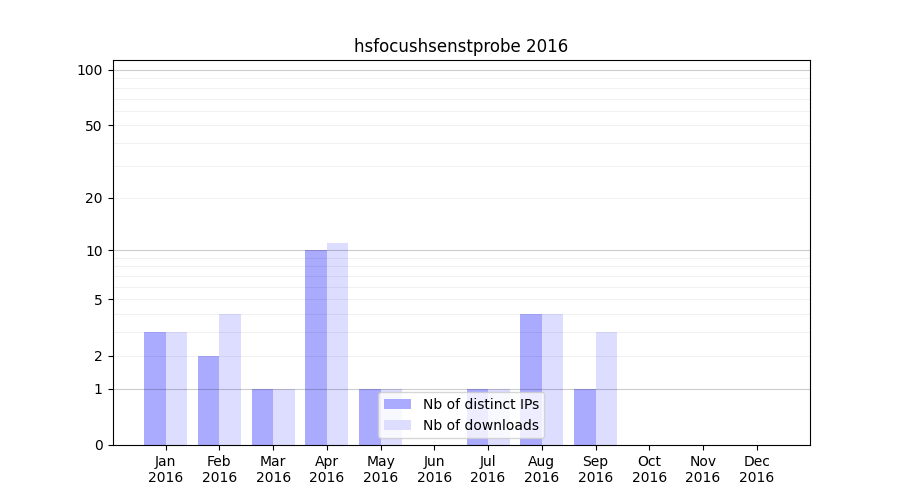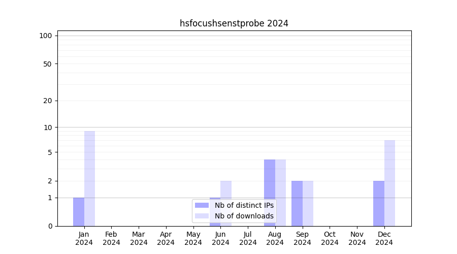 Number of downloads for annotation package hsfocushsenstprobe, year by year, from 2025 back to 2014 (years with no downloads are omitted):
