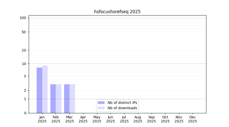 Number of downloads for annotation package hsfocushsrefseq, year by year, from 2025 back to 2014 (years with no downloads are omitted):