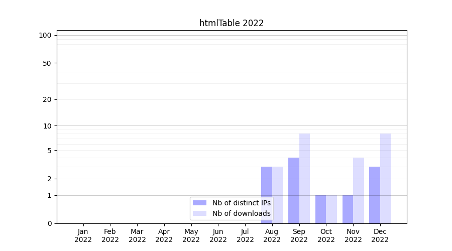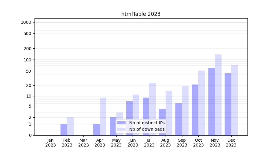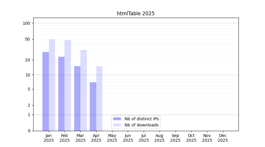 Number of downloads for annotation package htmlTable, year by year, from 2025 back to 2014 (years with no downloads are omitted):