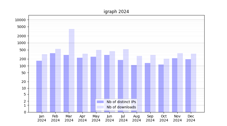 Number of downloads for annotation package igraph, year by year, from 2025 back to 2014 (years with no downloads are omitted):