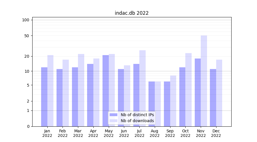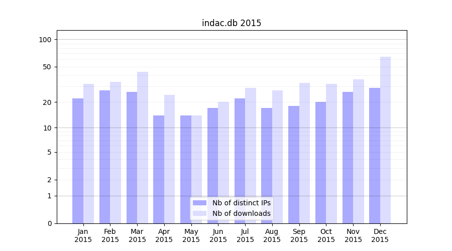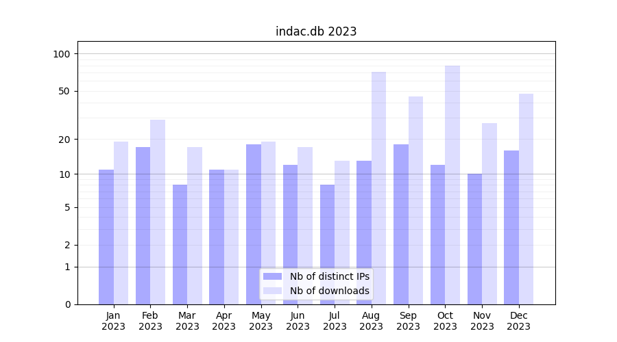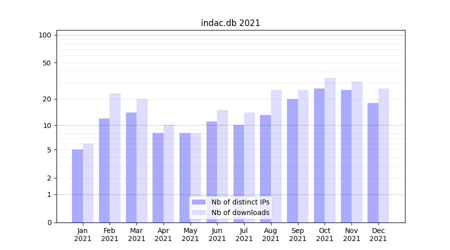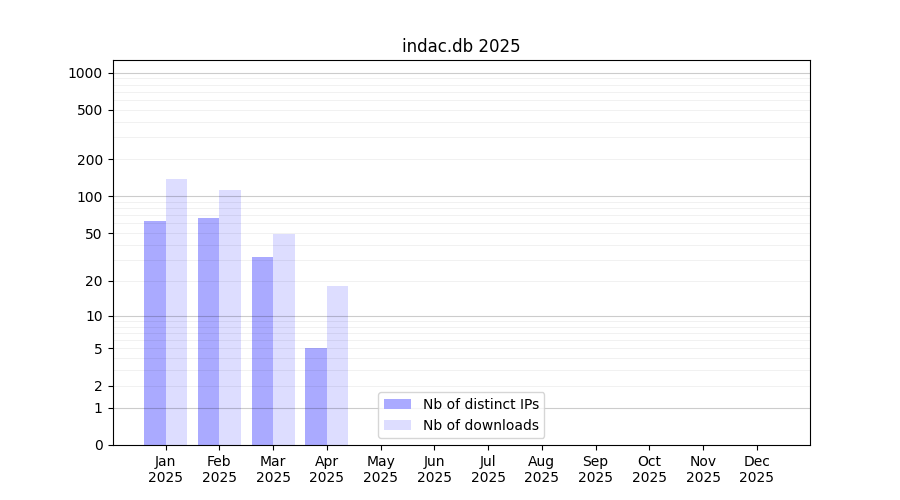 Number of downloads for annotation package indac.db, year by year, from 2025 back to 2014 (years with no downloads are omitted):