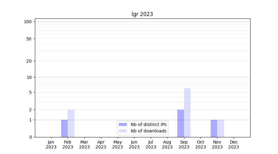 Number of downloads for annotation package lgr, year by year, from 2025 back to 2014 (years with no downloads are omitted):