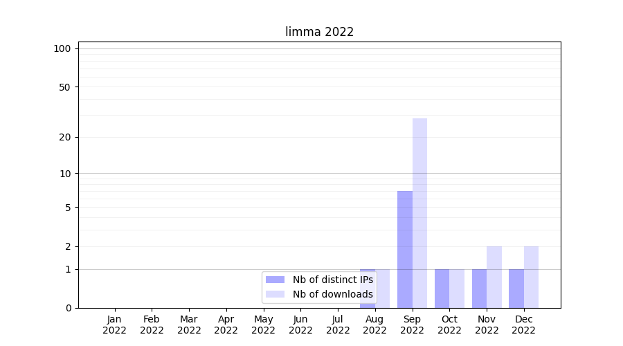 Number of downloads for annotation package limma, year by year, from 2025 back to 2014 (years with no downloads are omitted):