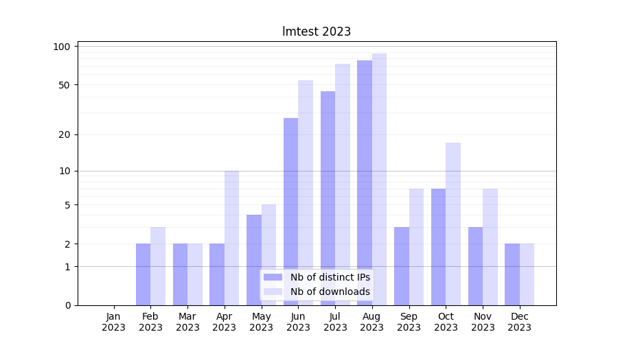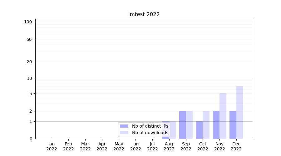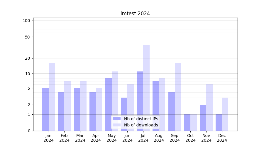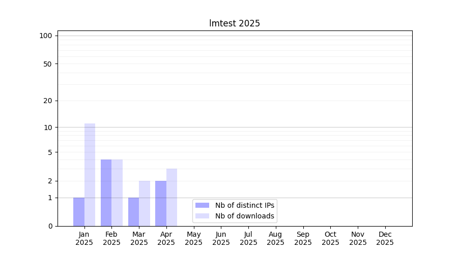 Number of downloads for annotation package lmtest, year by year, from 2025 back to 2014 (years with no downloads are omitted):