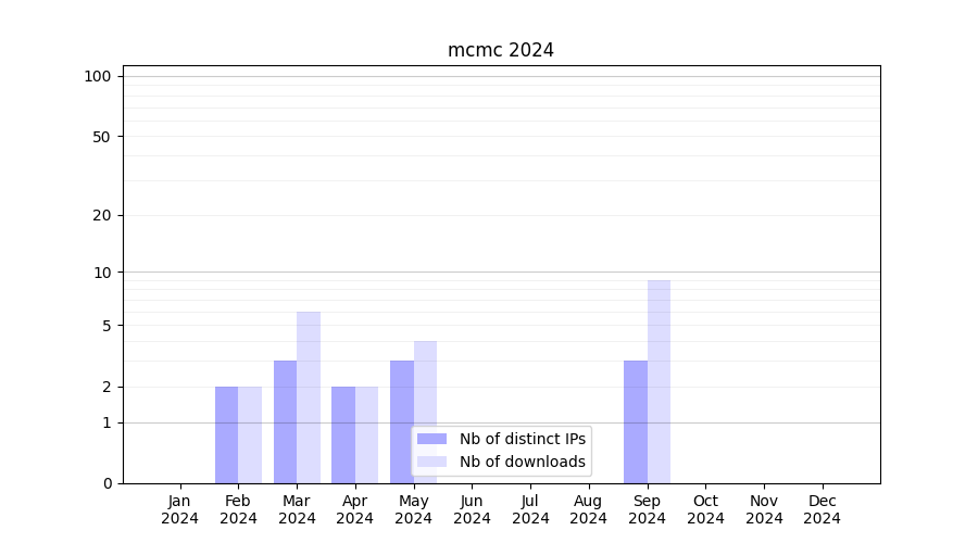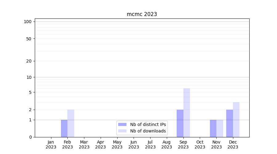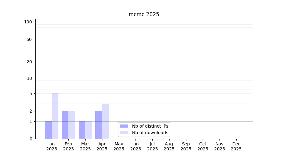 Number of downloads for annotation package mcmc, year by year, from 2025 back to 2014 (years with no downloads are omitted):