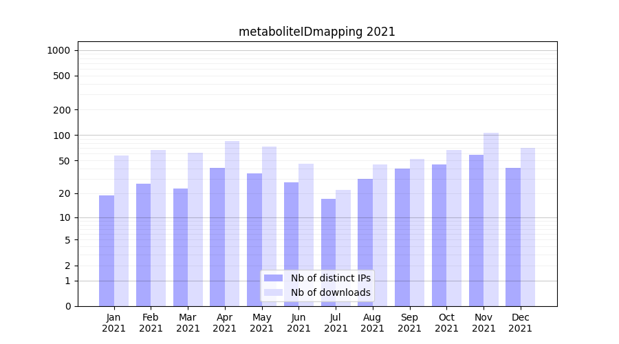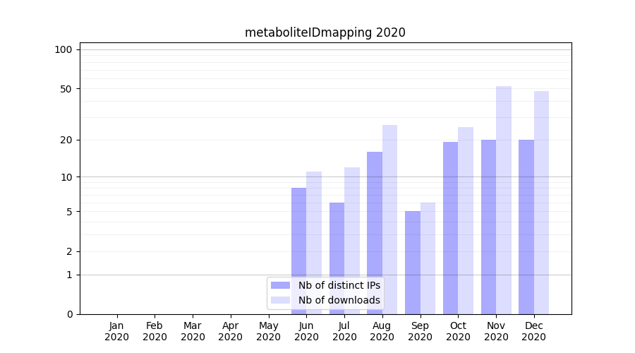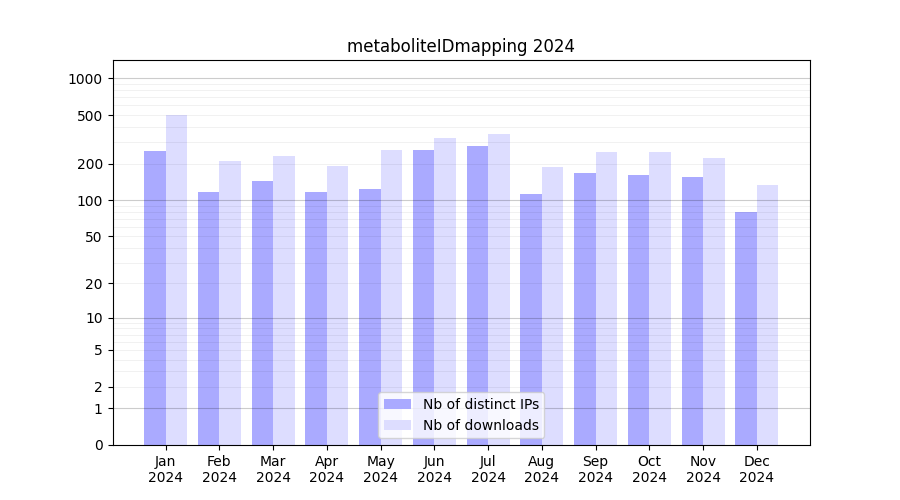 Number of downloads for annotation package metaboliteIDmapping, year by year, from 2025 back to 2014 (years with no downloads are omitted):