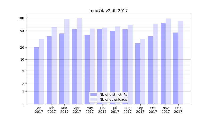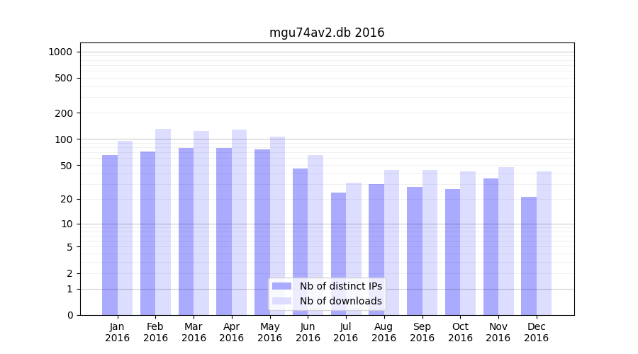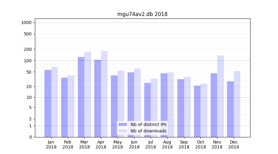 Number of downloads for annotation package mgu74av2.db, year by year, from 2025 back to 2014 (years with no downloads are omitted):