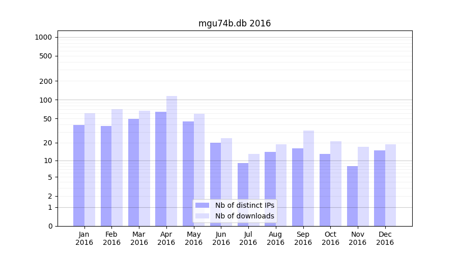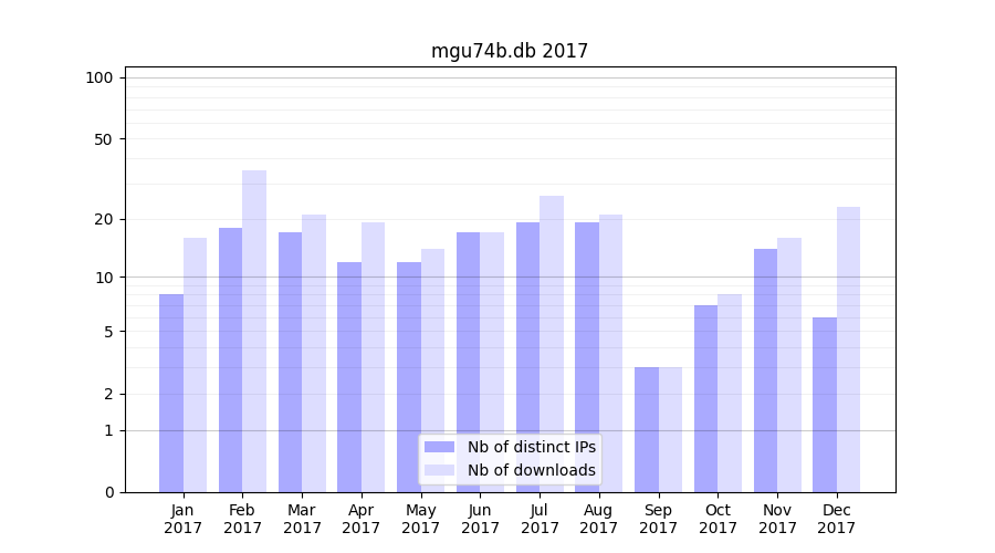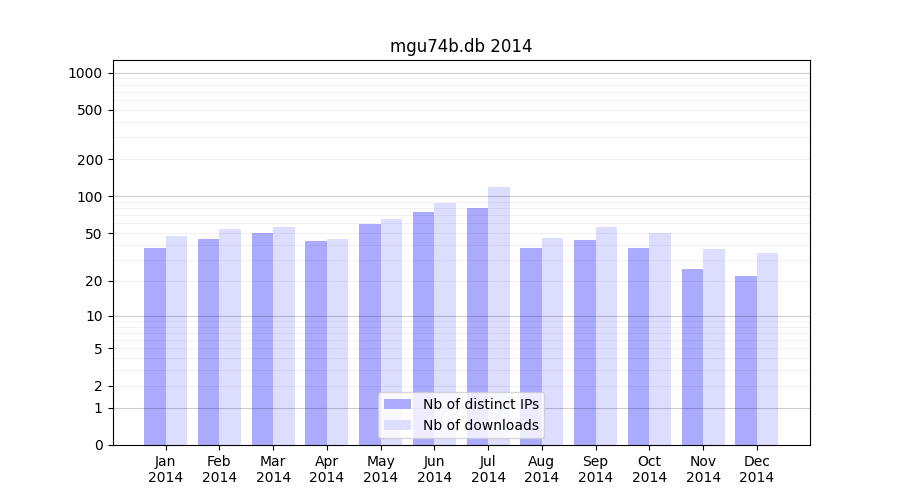 Number of downloads for annotation package mgu74b.db, year by year, from 2025 back to 2014 (years with no downloads are omitted):