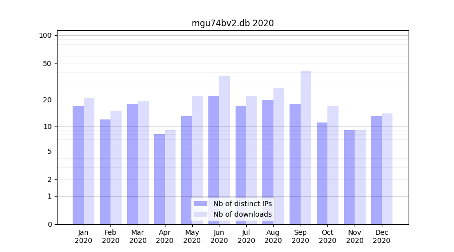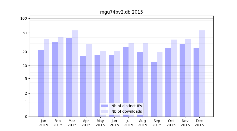 Number of downloads for annotation package mgu74bv2.db, year by year, from 2025 back to 2014 (years with no downloads are omitted):