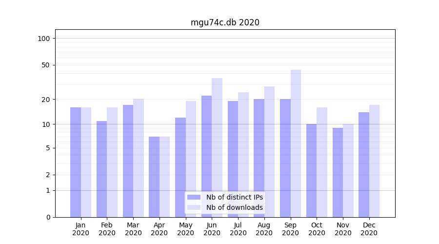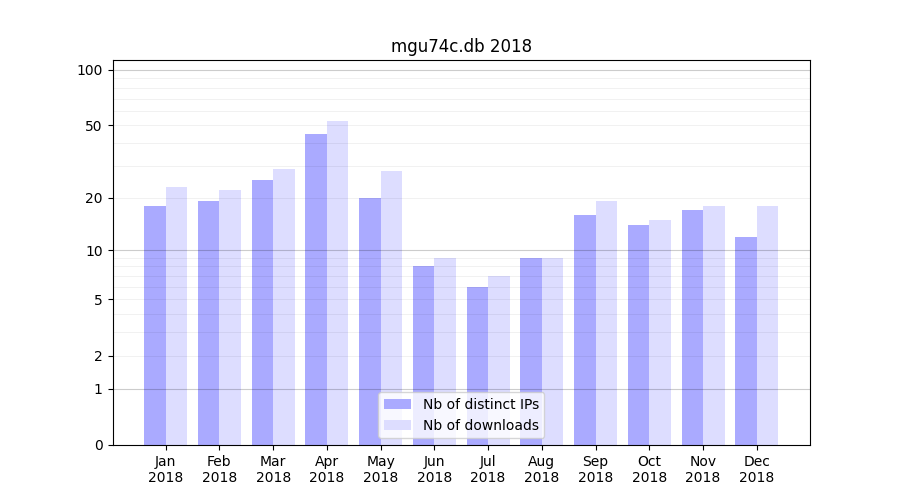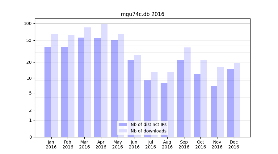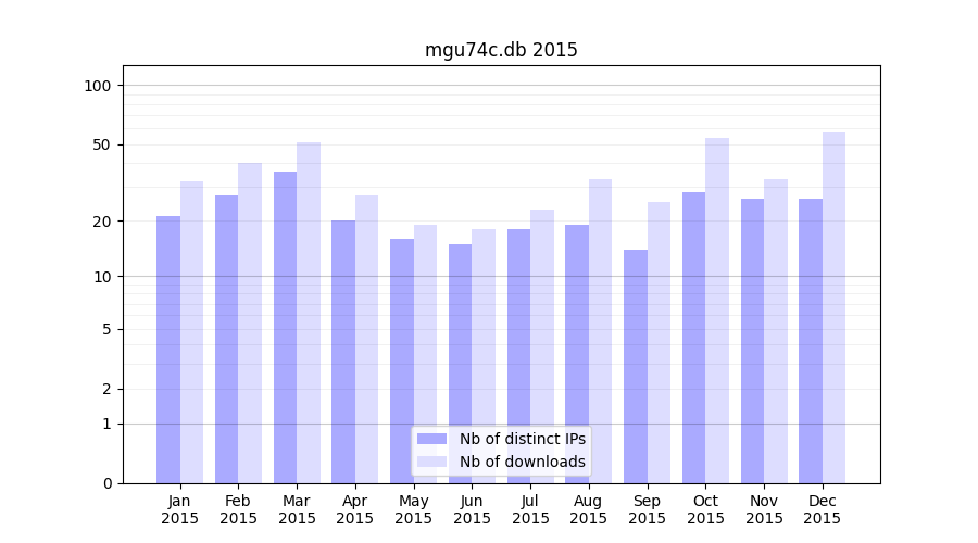 Number of downloads for annotation package mgu74c.db, year by year, from 2025 back to 2014 (years with no downloads are omitted):