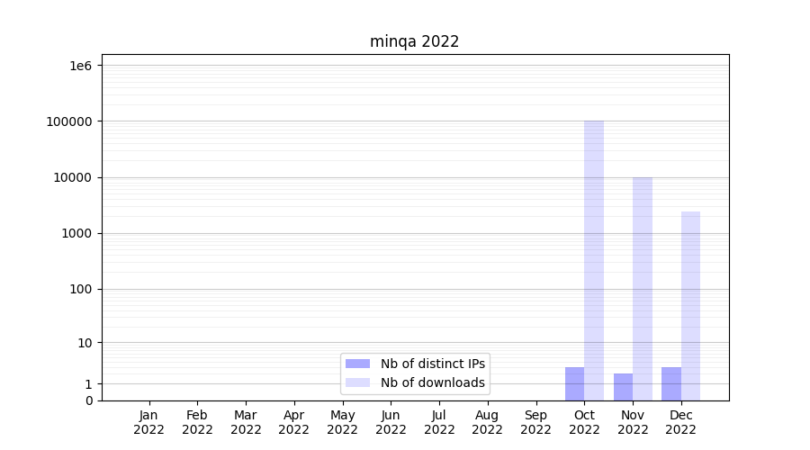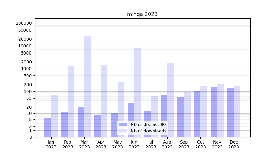 Number of downloads for annotation package minqa, year by year, from 2025 back to 2014 (years with no downloads are omitted):