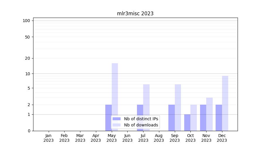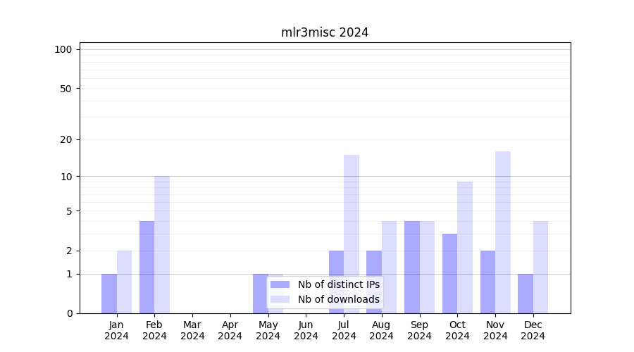 Number of downloads for annotation package mlr3misc, year by year, from 2025 back to 2014 (years with no downloads are omitted):