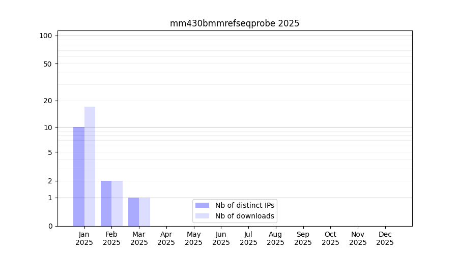 Number of downloads for annotation package mm430bmmrefseqprobe, year by year, from 2025 back to 2014 (years with no downloads are omitted):