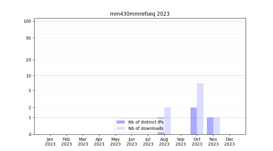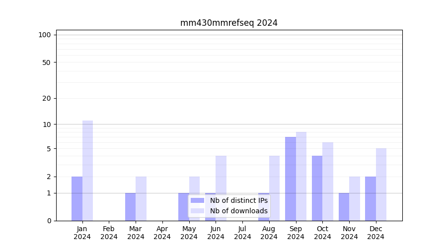 Number of downloads for annotation package mm430mmrefseq, year by year, from 2025 back to 2014 (years with no downloads are omitted):