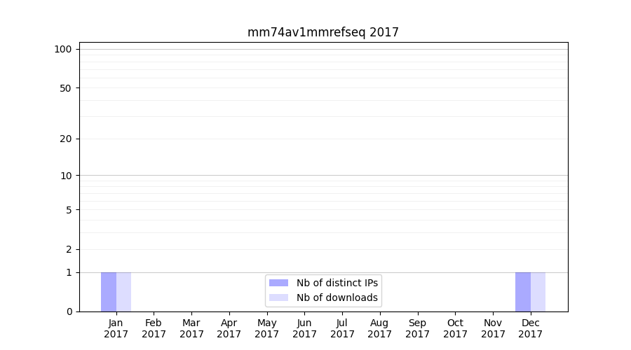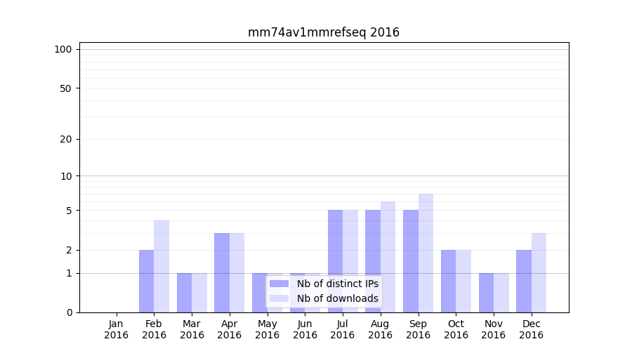 Number of downloads for annotation package mm74av1mmrefseq, year by year, from 2025 back to 2014 (years with no downloads are omitted):