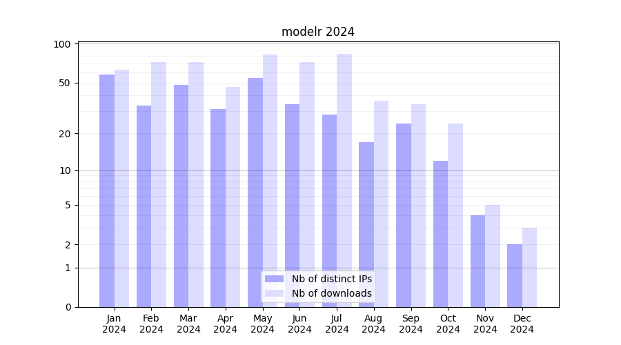 Number of downloads for annotation package modelr, year by year, from 2025 back to 2014 (years with no downloads are omitted):