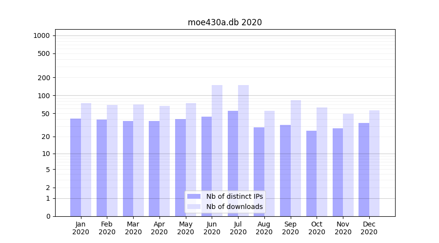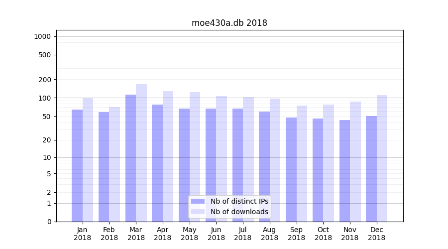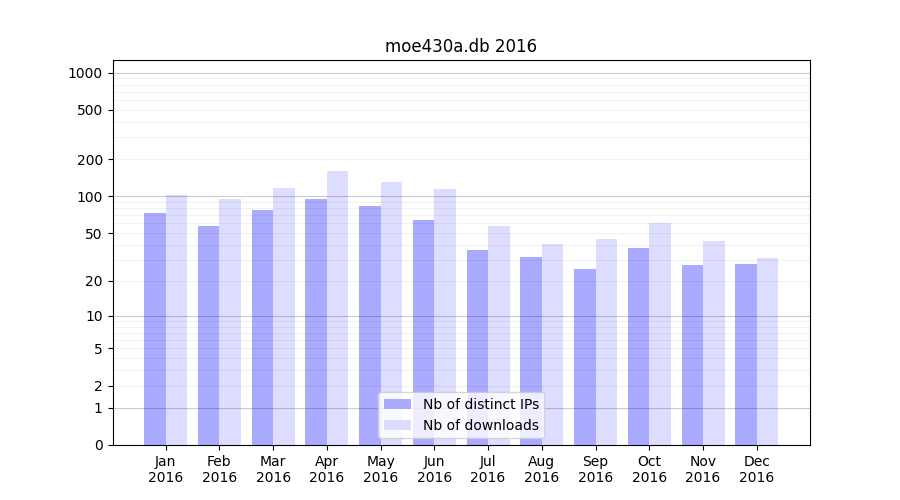 Number of downloads for annotation package moe430a.db, year by year, from 2025 back to 2014 (years with no downloads are omitted):